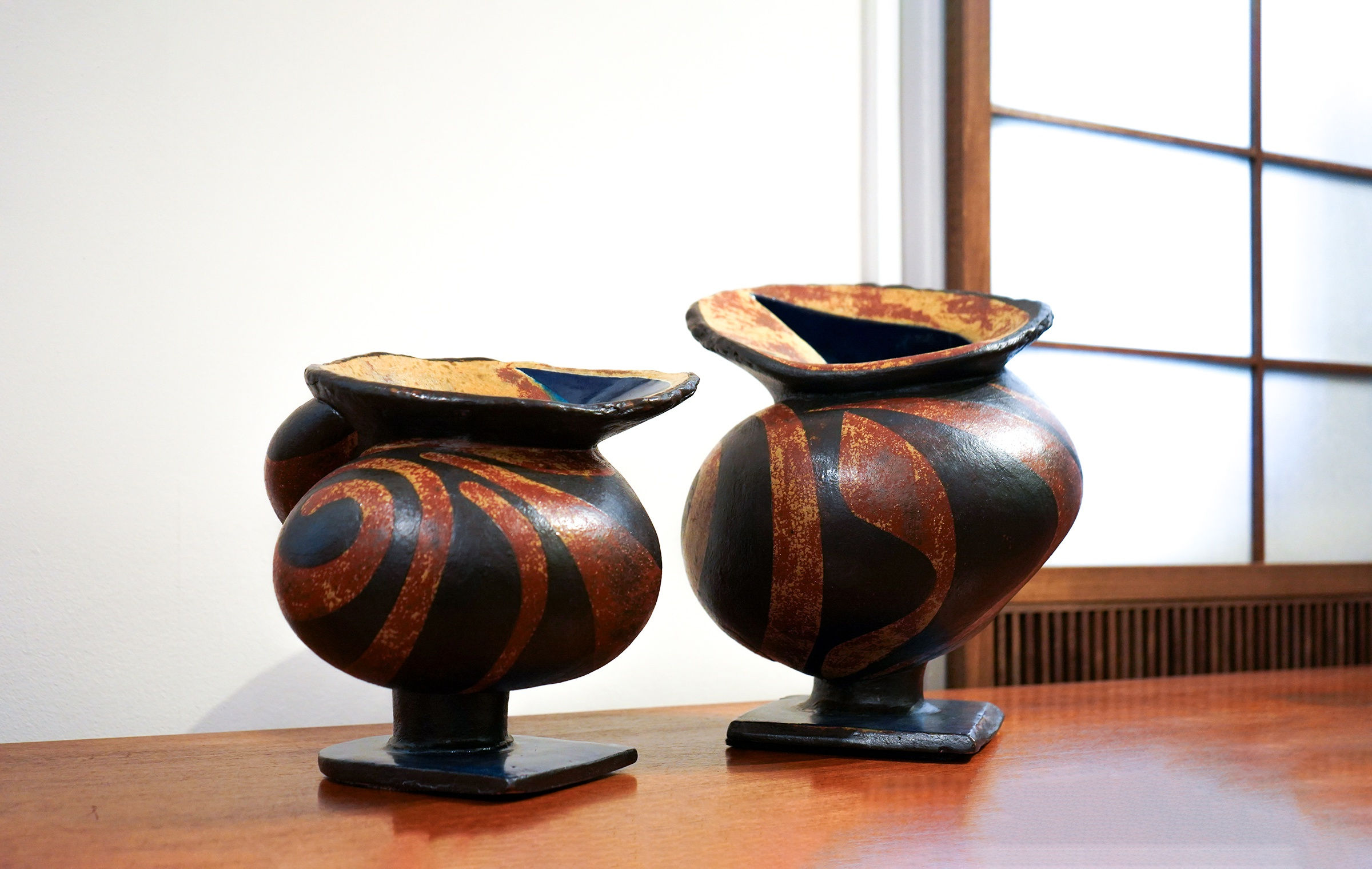 Expansive, curving edges, spiraling motifs, and meticulously articulated interiors draw the viewer’s gaze inward, inviting contemplation of both surface and depth. Swelling forms in pot-bellied vessels, and flaring rims imbues vessels with strength and presence. Every angle of a vessel reveals new tensions, new rhythms, new breath. His objects are modern, in constant flux and motion. Their mutable forms evoke a sense of movement and transformation, imbuing them with a lifelike quality.