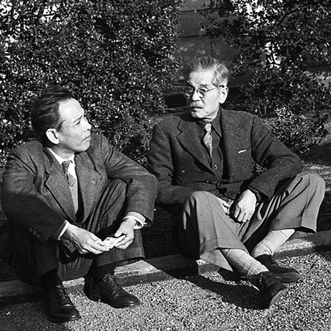 Yanagihara's teachers: Tomimoto Kenkichi (pictured to the right) and Kondō Yūzō (pictured to the left) photographed in Kyoto, 1956. Image courtesy Tomimoto Kenkichi Public Domain Archives and the Tsujimoto Isamu Collection.