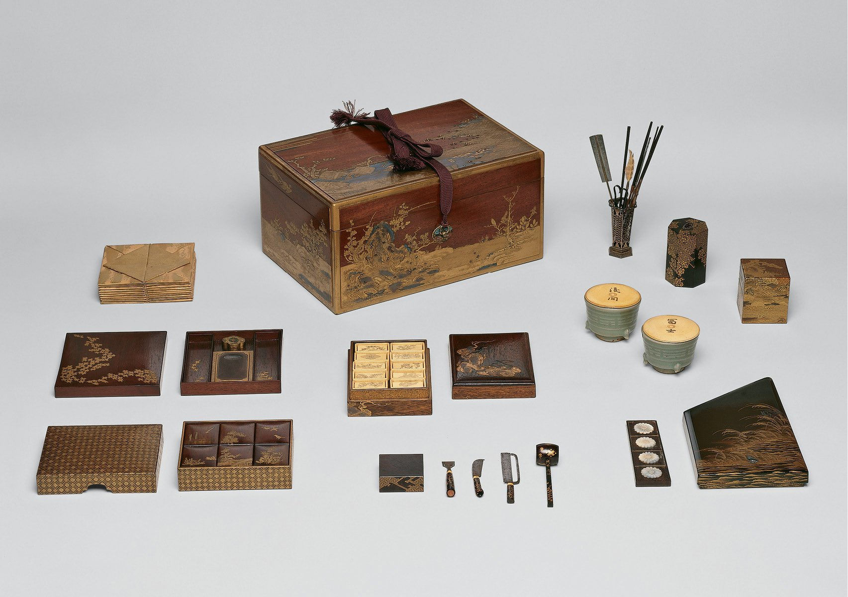 Box and assorted implements for the incense game, Lacquered wood, sprinkled gold; raised silver and gold designs, 17th-18th century, Japan. Mary Griggs Burke Collection, Gift of the Mary and Jackson Burke Foundation at the Minneapolis Institute of Art. Image courtesy of the Minneapolis Institute of Art. Click here to see more about the artwork.